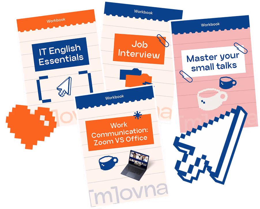 Всередині: Воркбуки IT English, підготовка до співбесіди, робоча комунікація на зумах та в офісі, small talks з колегами