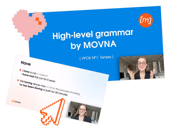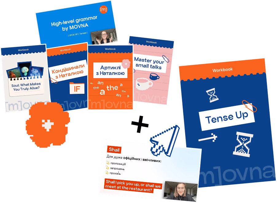 Всередині: Курс Tense Up та інтенсив «High-Level Grammar» + воркбуки: Conditionals, артиклі A/AN/THE, small talks і практика через фільми 🧡