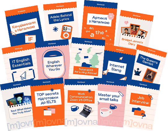 Воркбуки – диджитал посібники з теорією, вправами та ключами до них (в воркбуці про артиклі та кондішинали ще є відеолекції від нашої Наталки, а в воркбуці Bridget Jones є також відео майстер-клас від Ксенії, нашої Менторки на Level Up). Наповнення різне і супер корисне. Сучасна і актуальна лексика відповідно до теми воркбуку, актуальні поради та рекомендації від наших методистів